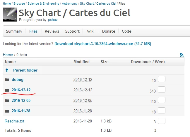 Автор Cartes du Ciel — Patrick Chevalley постоянно развивает свою программу. Стоит отметить, что первая версия программы датируется аж 2001 годом и была написана на Delphi 5. Сейчас программа пишется на Lazarus и сразу для всех платформ: Windows, Linux и Mac. Новые версии (3.x) выходят почти каждую неделю и содержат все исправления и нововведения. Патрик очень щепетильно относится к изменениям и из-за этого решил разделить версии на стабильную и бета-версию.