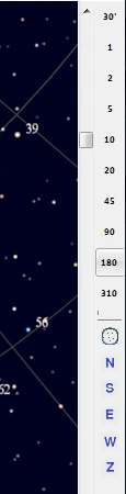 Кнопки «N», «S», «E», «W» и «Z» позволяют установить направление обзора: север, юг, восток, запад и зенит. Обрати внимание, что эти кнопки сразу переключают карту на азимутальную систему коордионат (кнопка «AZ» на левой панели). Азимутальная система коордионат используется, когда тебе необходимо получить вид неба с привязкой к горизонту.