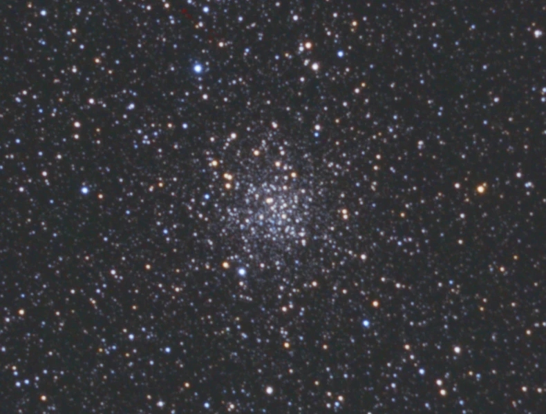 На выходе получится примерно такое изображение. Это центр M71 в 100% масштабе. На снимке я сильно увеличил насыщенность и яркость, чтобы показать цвет звёзд (поэтому на нём вылезли искажения).