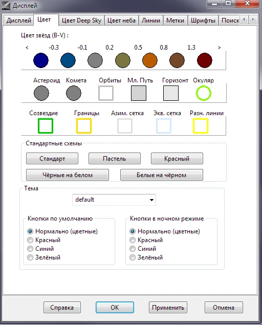 Следующим этапом идет подбор баланса белого. Баланс я выставляю только по желтым звёздам. На небе синих и голубых звезд практически нет (их доля менее 1%), поэтому основной «контингент» это белые (слабо желтые) как наше Солнце и оранжевые до редких красных. Найти оранжевую звезду гораздо проще. В процессе выставления ББ я часто пользуюсь картами Cartes du Ciel, который я настроил таким вот забавным способом, но который позволяет безошибочно определить цвет.